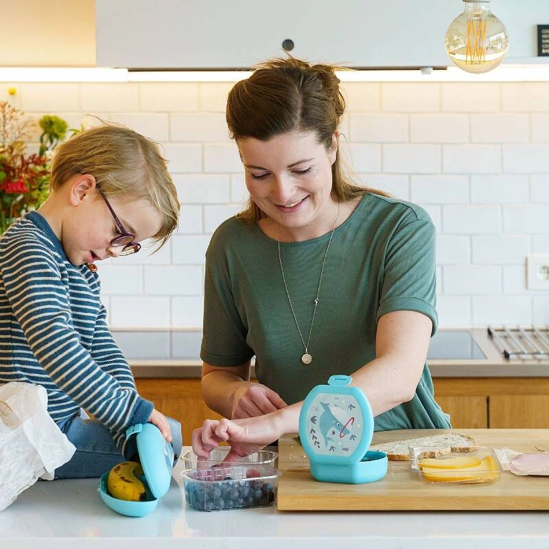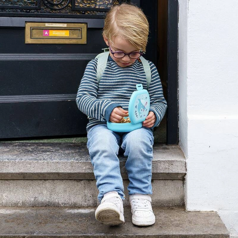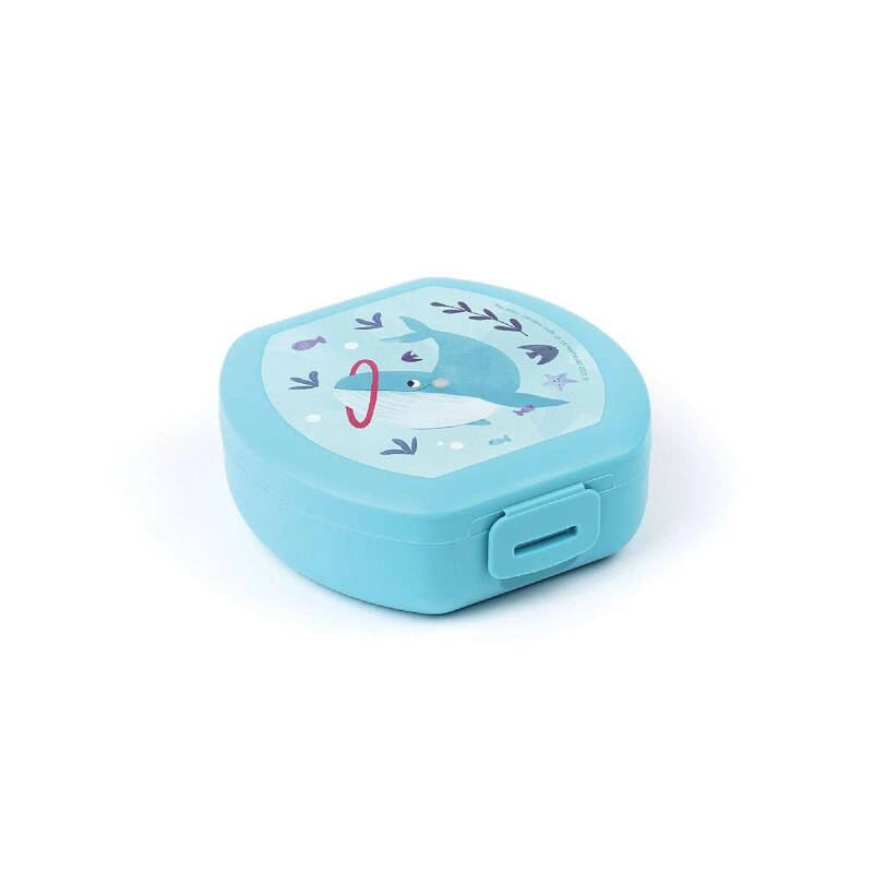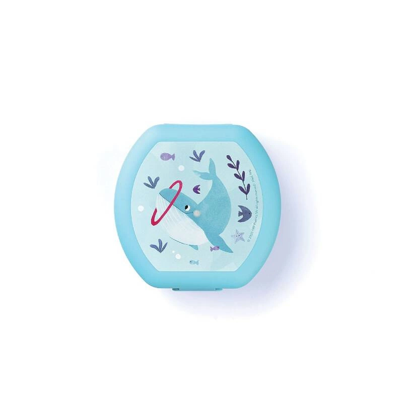 Pojemnik na przekąskę do szkoły z grafiką wieloryba i z wygodnym otwieraniem za pomocą klipsa. Można myć w zmywarce. Nadaje się do recyklingu. Certyfikat do kontaktu z żywnością. Europejska produkcja z tworzywa bez BPA. Odporny na temperaturę od -30°C do +100°C. Wymiary: 11.2 x 11 x 4 cm.