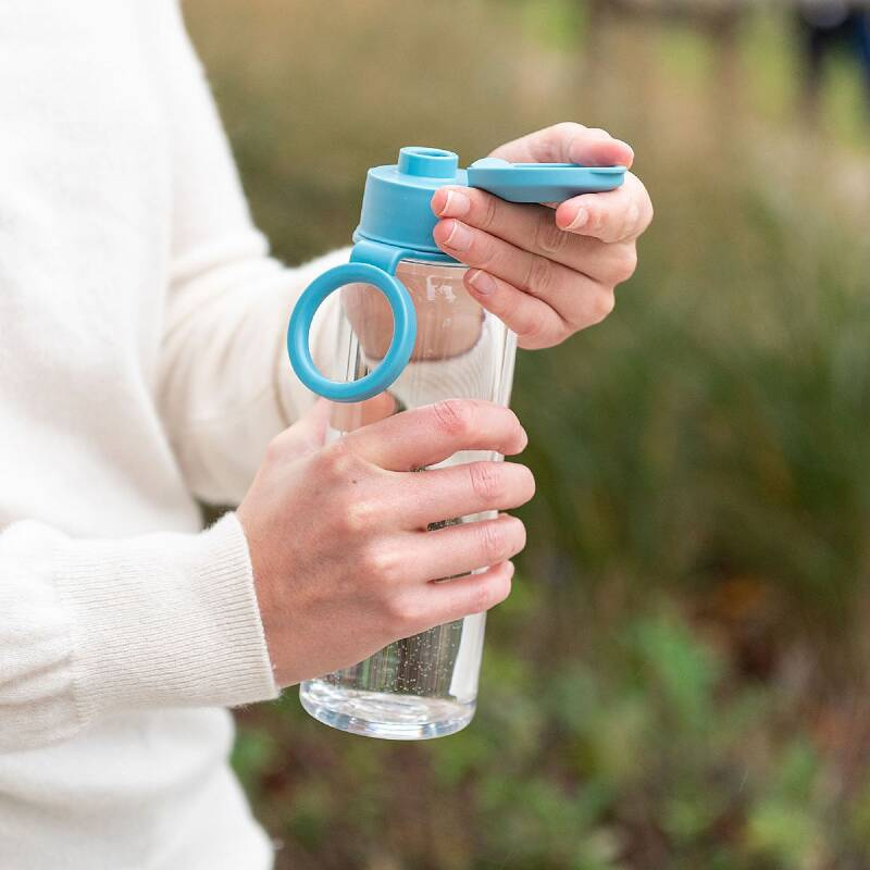 Lekka butelka na wodę z uchwytem dla dzieci i dorosłych z higienicznym ustnikiem ukrytym pod klapką. Można myć w zmywarce. Nadaje się do recyklingu. Certyfikat do kontaktu z żywnością. Europejska produkcja z tworzywa bez BPA. Odporna na temperaturę od -30°C do +100°C. Nie używać w mikrofalówce. Wymiary: 6,5 x 6,5 x 21,5 cm. Poj.: 500 ml.