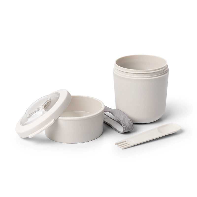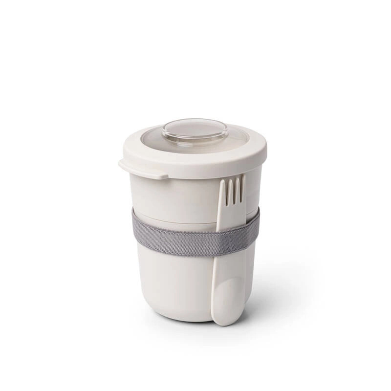 Pojemnik na przekąskę lub jogurt. Wygodne otwieranie i zamykanie oraz pokrywka z okienkiem. pojemnik składa się z 2 miseczek, które oddzielają produkty suchych od mokrych. W zestawie znajduje się tzw. łyżkowidelec. Można myć w zmywarce. Nadaje się do recyklingu. Certyfikat do kontaktu z żywnością. Wyprodukowany w UE z tworzywa BPA free. Odporny od -30°C do +100°C. Pojemność: 0,15L = 150ml + 0,45L = 450ml. Wymiary: 10.5 x 14.2 cm