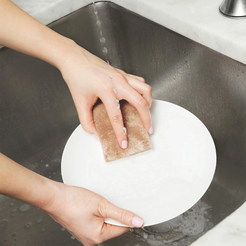 Gąbka naturalna do naczyń zmywa dzięki łupinom orzecha włoskiego. Chłonna i ścierna naturalna gąbka do zmywania doskonale czyści naczynia, a jej biała powierzchnia jest idealna na czyszczenia blatów, kuchennych, sprzętów AGD i wiele więcej. 2-stronne gąbki generują niepotrzebne odpady. Naturalne łupiny kokosa zapewniają efektywne szorowanie, bez konieczności stosowania plastiku. Produkt jest przyjazny osobom mającym alegrie na orzechy - nie wywołuje reakcji uczuleniowych. Skład: łupiny orzecha włoskiego, celuloza i plastik z certyfikowanego recyklingu. Wolne od triklosanu i toksyn. Zestaw zawiera 2 sztuki. Wymiary: 11,3 x 7 x 2 cm.