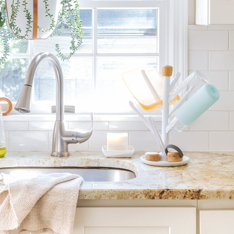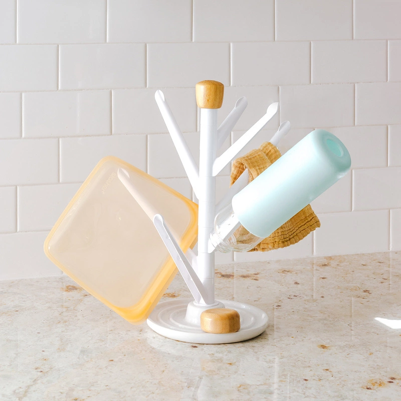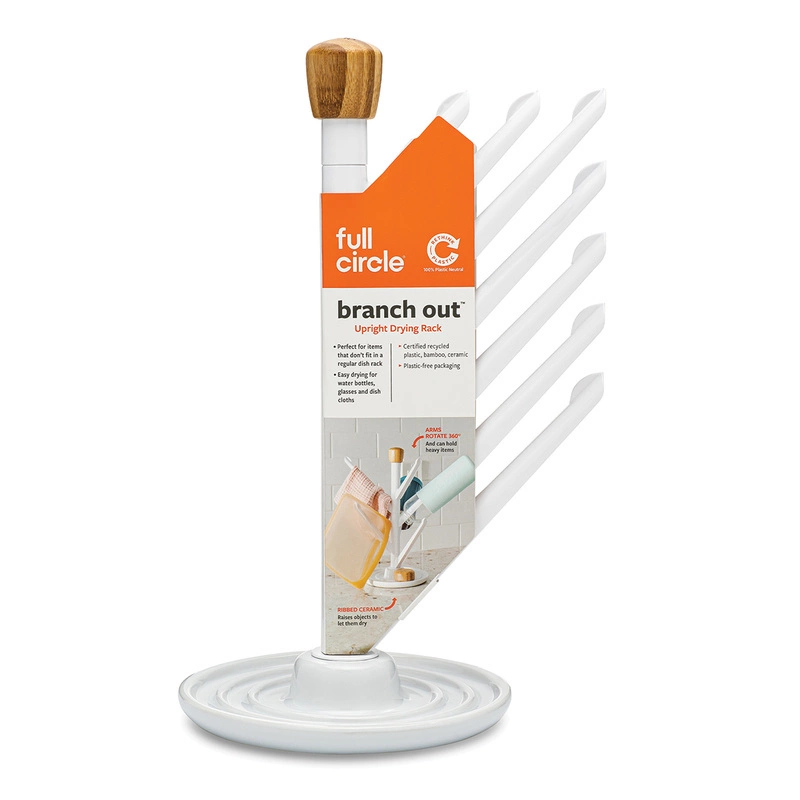 Suszarka do butelek, kubków i na ścierek. 7 obrotowych ramion uniesie cięższe naczynia, takie jak szklane butelki, ceramiczne kubki, a jego kompaktowa konstrukcja zajmuje mało miejsca na blacie. Ruchome ramiona suszarki mają różne długości mogą się niezależnie obracać. Wykonany z certyfikowanego plastiku, bambusa i ceramiki z recyklingu.Myć ręcznie ciepłą woda z płynem do mycia naczyń. Ceramiczną podstawę można myć w zmywarce. Wymiary: 35.6 x 17 x 17 cm