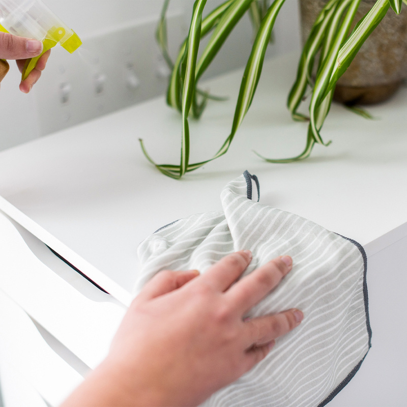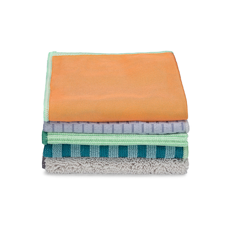 5 ściereczek z recyklingowanej mikrofibry. Każda z nich ma swoje przeznaczenie, co pozwala skutecznie wykonywać różnorodne zadania, jak czyszczenie łazienkowych powierzchni + kafelek (ściereczka z paskami do szorowania!), odkurzanie, do szkła, do czyszczenia piekarników i płyt kuchennych oraz do stali nierdzewnej. Ściereczki  pochodzą z recyklingu i posiadają certyfikat Global Recycled Standard (GRS). Każdy zestaw ściereczek pozyskany jest z około 6 plastikowych butelek przyczyniając się do redukcji odpadów. Praktyczne pętelki do zawieszania. Stworzone z myślą o zrównoważonym stylu życia, te ściereczki skutecznie usuwają brud bez konieczności stosowania chemikaliów Skład: 80% poliestru z recyklingu i 20% poliamidu. Wymiary: Wymiar każdej ściereczki to 30,5 cm x 0,2 cm x 30,5 cm.
