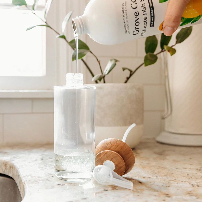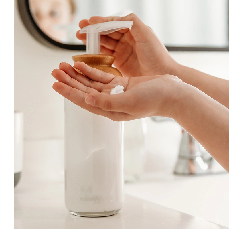 Szklany dozownik z pompką na mydło do rąk, płyn do naczyń lub na balsam do ciała. Silikonowa podstawa dna dozownika. Pojemnik wykonany ze szkła pochodzącego z recyklingu. Opakowanie bez plastiku. Wymiary: 6.4 x 6,4 x 19,3 cm. Pojemność: 354 ml.