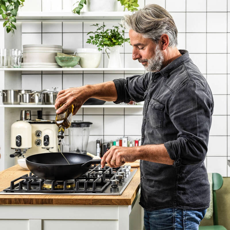 Wok Classic Forged Aluminium KitchenAid świetnie sprawdza się podczas codziennego użytkowania. Rączka o unikalnej konstrukcji w kształcie V, jest niepołączona nitami z boczną krawędzią naczynia, dzięki czemu dłużej pozostaje chłodna i znacznie ułatwia czyszczenie patelni od wewnątrz. Aluminiowy korpus patelni został pokryty 3-warstwową, ceramiczną powłoką nieprzywierającą Thermolon™ Infinity (bez PFOA), która została wzmocniona diamentami - dobrze rozprowadza i utrzymuje ciepło i jest łatwa do czyszczenia. Energooszczędne dno Magneto zapewnia wydajność na wszystkich źródłach ciepła, w tym kuchenkach indukcyjnych. Woka należy używać na średnich mocach kuchenek. Wok można używać także w piekarniku do +160°C. Uwaga: podczas używania na kuchence gazowej, nie dopuszczać aby płomienie wystawały poza obrys patelni, może to prowadzić do przegrzania i uszkodzenia rączek wykonanych z bakelitu.Wok można myć w zmywarce. Natomiast w celu zachowania nieskazitelnego wyglądu oraz właściwości nieprzywierających na dłużej zaleca się mycie ręczne. Przed umyciem patelnię należy wystudzić.
