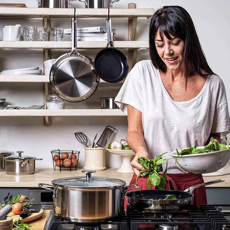 Patelnia ze stali nierdzewnej o średnicy 28 cm z ceramiczną powłoką nieprzywierającą ma grube dno, które szybko i równomierne rozprowadza ciepło. Pokryta ceramiczną powłoką bez związków PFAS, kadmu, ołowiu itd. 100% zdrowa powłoka ceramiczna. Do stosowania na wszystkich źródłach ciepła, w tym na kuchenkach indukcyjnych. W piekarniku w max temperaturze do 200°C.