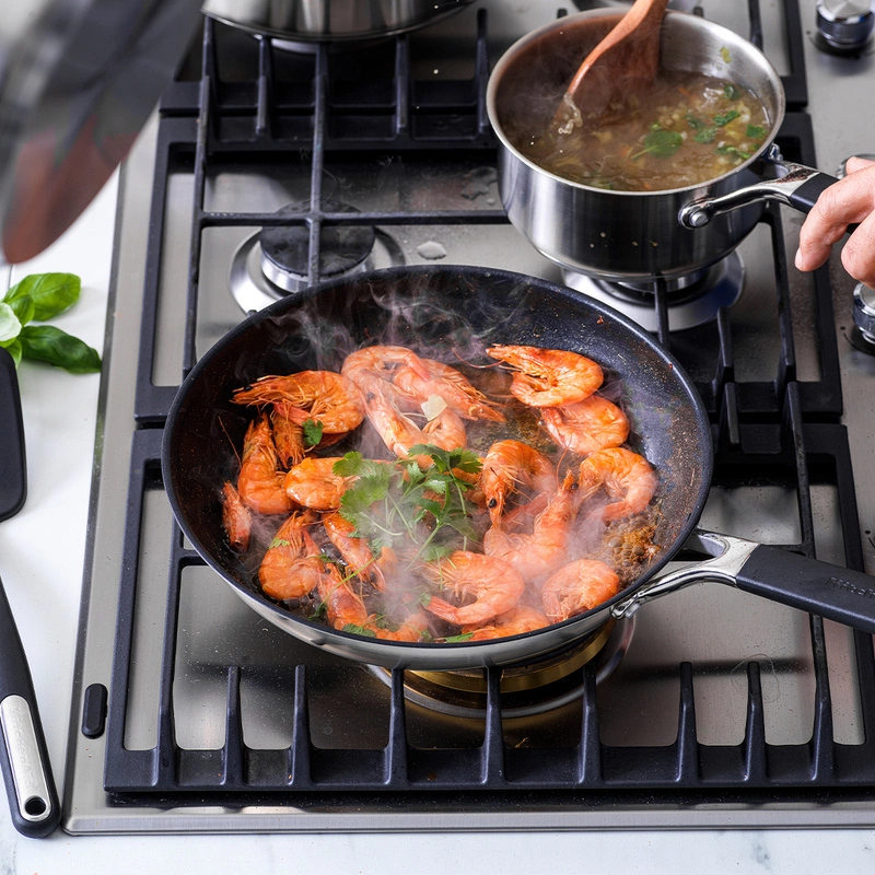 2 patelnie ze stali nierdzewnej z ceramiczną powłoką o grubych dnach szybko i równomiernie rozprowadzają temperaturę. Patelnie wykończone są wielowarstwową powłoką nonstick bez związków PFAS. Ergonomiczne uchwyty wykonane z bakelitu zapewniają wygodny chwyt, wolniej się nagrzewają. Do użytku na wszystkich kuchenkach i w piekarniku do 160°C. Można myć w zmywarce.