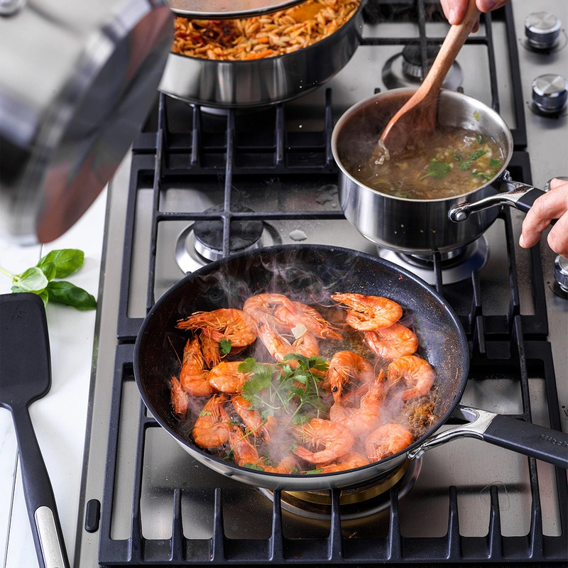 Patelnia wykończona wielowarstwową powłoką non-stick bez związków PFAS.