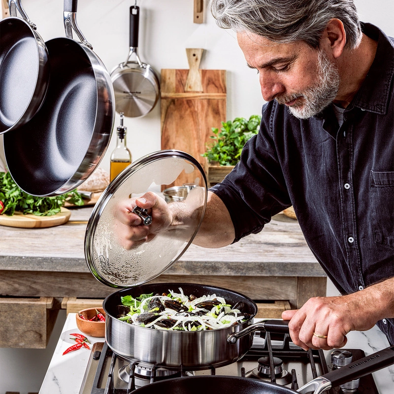 Głęboka stalowa patelnia KitchenAid ze szklaną pokrywką