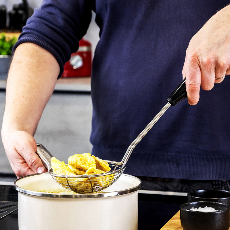 Łyżka druciana cedzakowa to nieodzowny pomocnik podczas gotowania, blanszowania, smażenia w głębokim tłuszczu oraz dań z woka. Długi uchwyt zapewniający bezpieczną odległość dłoni od gorących płynów. Wygodny uchwyt z tworzywa z błyszczącym efektem. Można myć w zmywarce. Wymiary: 36 x 13 cm.