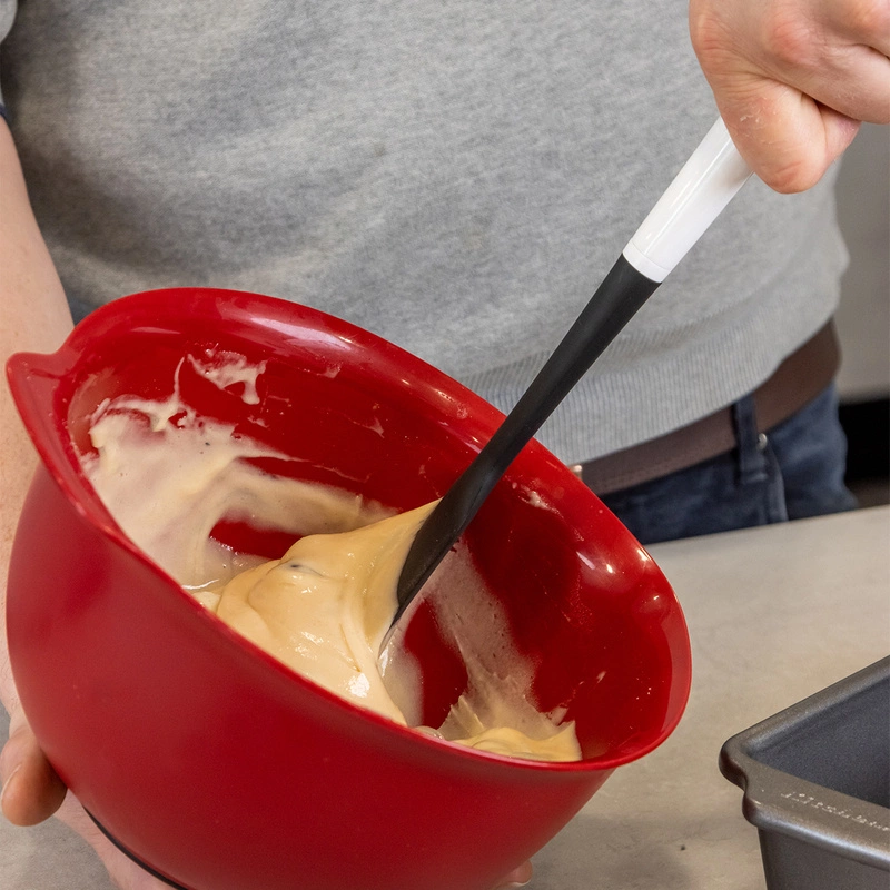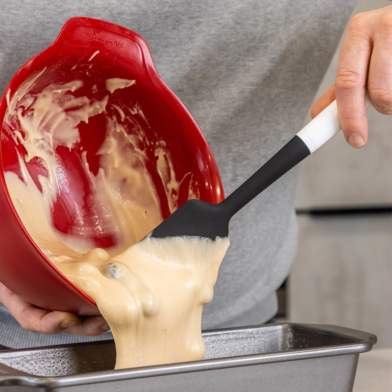 Silikonowa szpatuła KitchenAid jest elastyczna i skośna co gwarantuje dotarcie do trudno dostępnych naczyń. Odporna na temperatury do 250°C. Nie rysuje naczyń z powłokami antyprzywieralnymi. Można myć w zmywarce. Wymiary: 30 x 5,5 cm