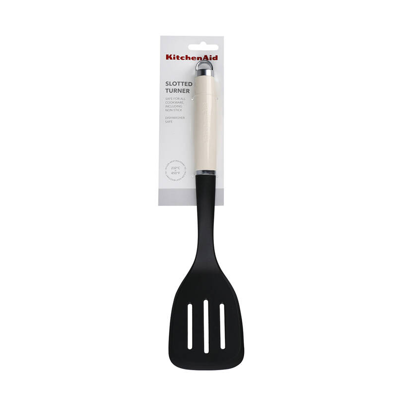 Szpatuła kuchenna KitchenAid w kolorze Almond Cream odporna na temperaturę do 232°C. Bezpieczna dla naczyń z powłokami non-stick. Wygodny uchwyt z uszkiem do zawieszenia. Można myć w zmywarce. Podczas smażenia nie pozostawiać w patelni. Wymiary: 8.5 x 4.5 x 35.5 cm.