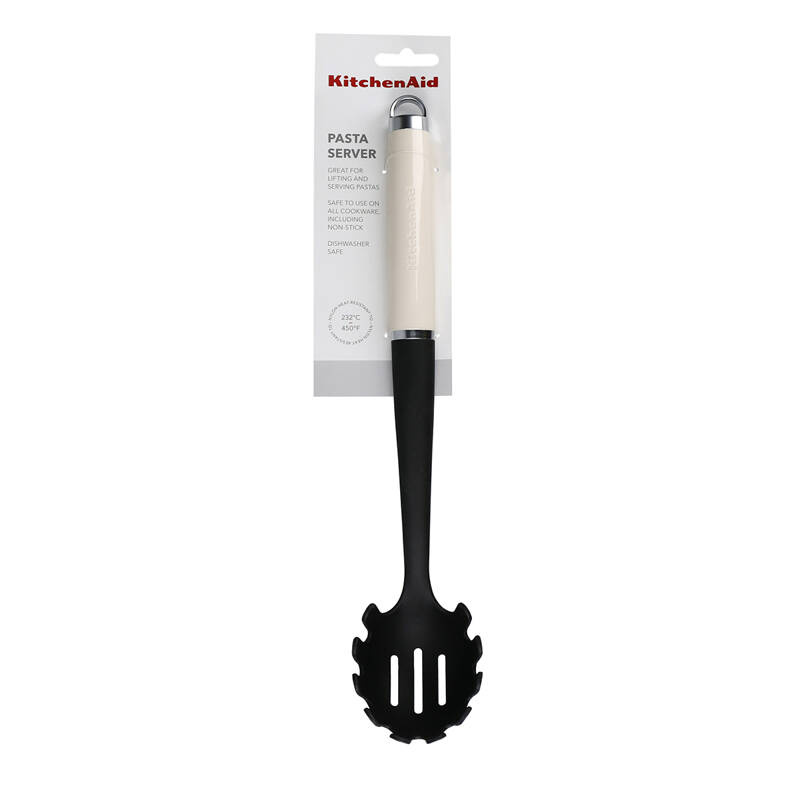 KitchenAid Culinary Tools - łyżka do makaronu CORELINE Almond Cream Łyżka do makaronu wykonana z tworzywa odpornego na temperaturę do 232°C. Bezpieczna dla naczyń z powłokami non-stick. Wyprofilowany uchwyt z uszkiem do zawieszenia. Można myć w zmywarce. Wymiary: 35 x 7 cm.