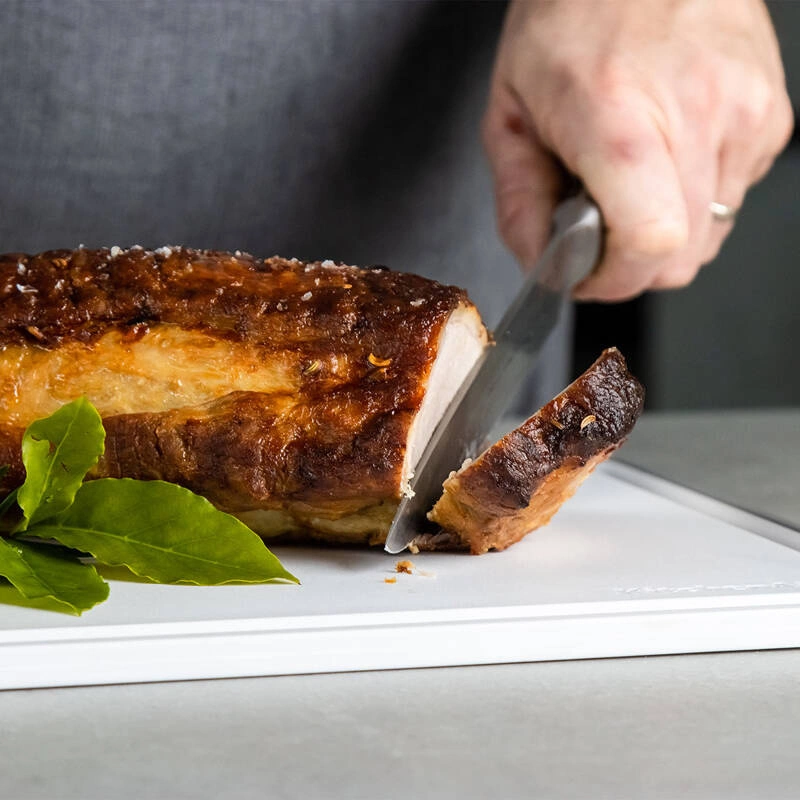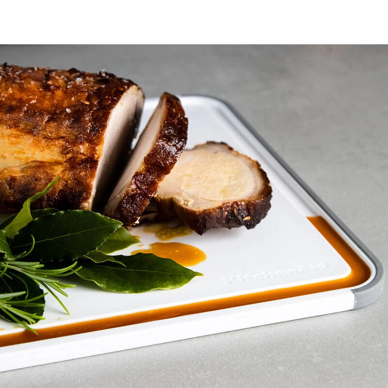 KitchenAid Culinary Tools - deska do krojenia 28 x 36 cm Deska kuchenna obustronna z tworzywa z rowkiem na płyny z bezpiecznego tworzywa, które nie wchłania wilgoci oraz zapachów. Łagodna dla ostrzy noży. Antypoślizgowe krawędzie boczne. Można myć w zmywarce.