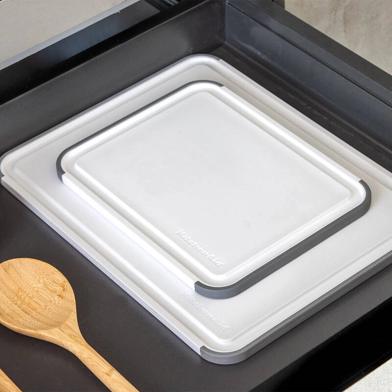 KitchenAid Culinary Tools - deska do krojenia 20 x 25 cm Deska kuchenna obustronna z tworzywa z rowkiem na płyny z bezpiecznego tworzywa, które nie wchłania wilgoci oraz zapachów. Łagodna dla ostrzy noży. Antypoślizgowe krawędzie boczne. Można myć w zmywarce.