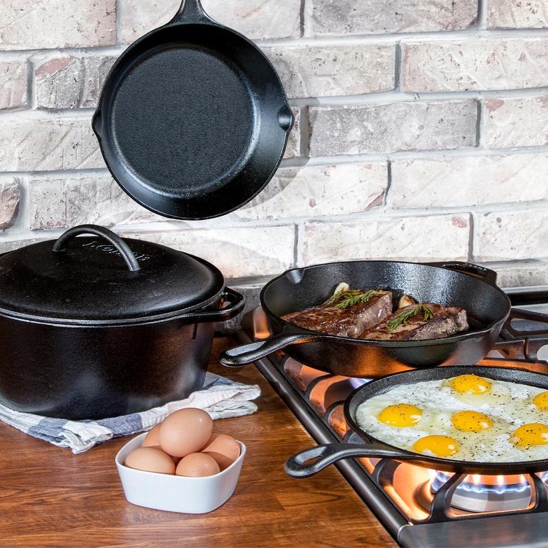 Komplet trzech żeliwnych naczyń do gotowania i smażenia na dowolnym źródle ciepła, także na ognisku, grillu, indukcji i w piekarniku. W skład zestawu wchodzą: garnek z pokrywką 4,7 litra (L8DOL3), patelnia 20 cm (L5SK3INT), patelnia 26 cm (L8SK3INT) i patelnia do naleśników 26,5 cm (L9OG3INT).
