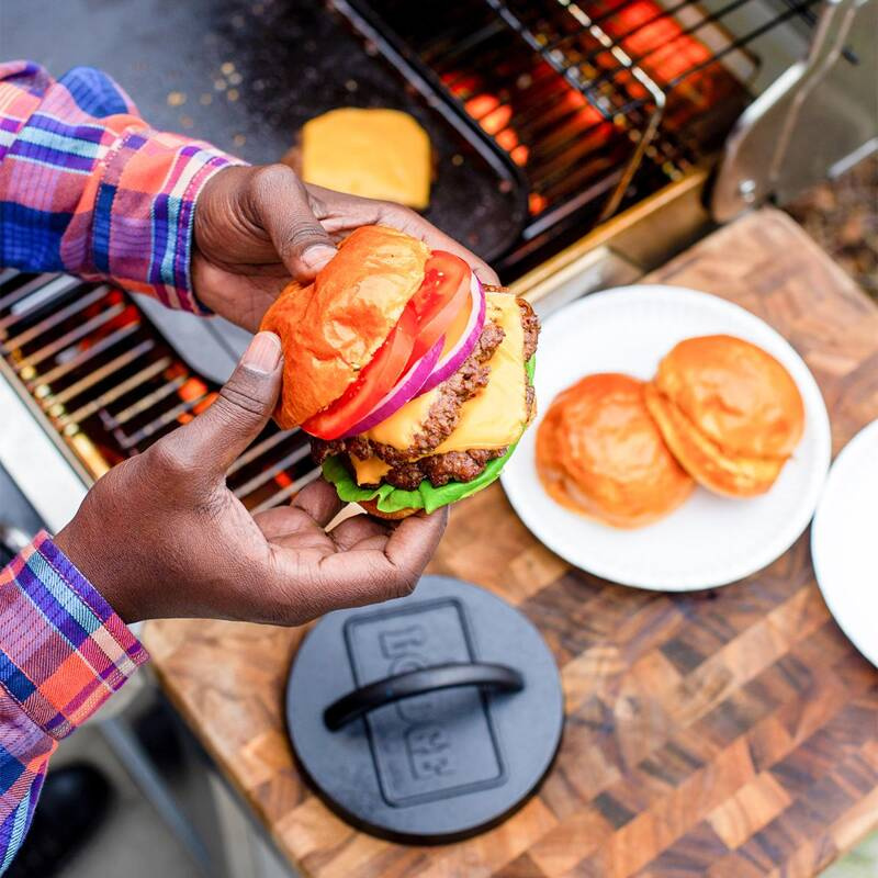 Praska do grillowania burgerów. Dzięki wadze 0,79kg, dokładnie dociska mięso do powierzchni płyty lub patelni grillowej i kumuluje ciepło. Praskę można również stosować podczas smażenia na patelni, pieczenia w piekarniku, na ognisku oraz grillowania na domowych płytach do grillowania. Podczas korzystania z praski należy pamiętać, aby używać rękawic ochronnych do gorących naczyń.