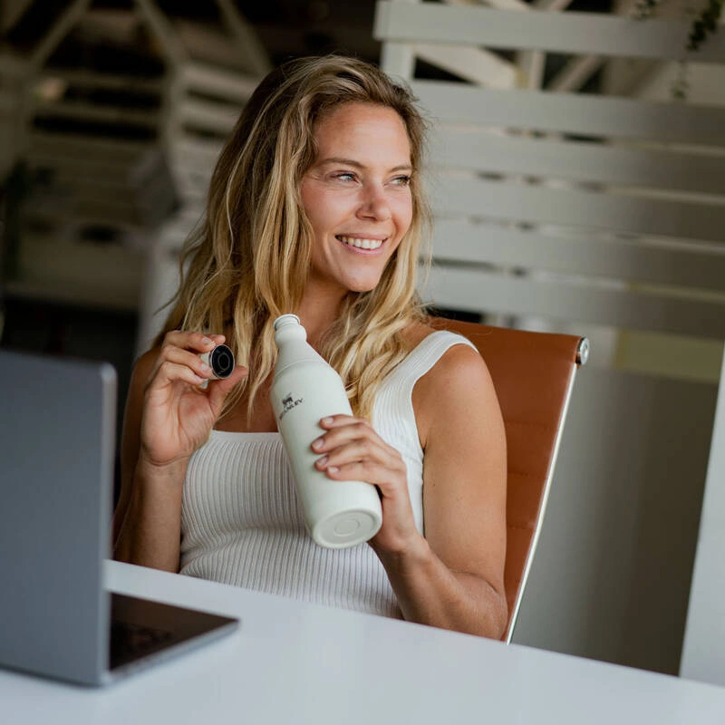 - tradycyjny kształt z praktycznym rozwiązaniem z dwoma otworami do picia i łatwiejszego mycia butelki