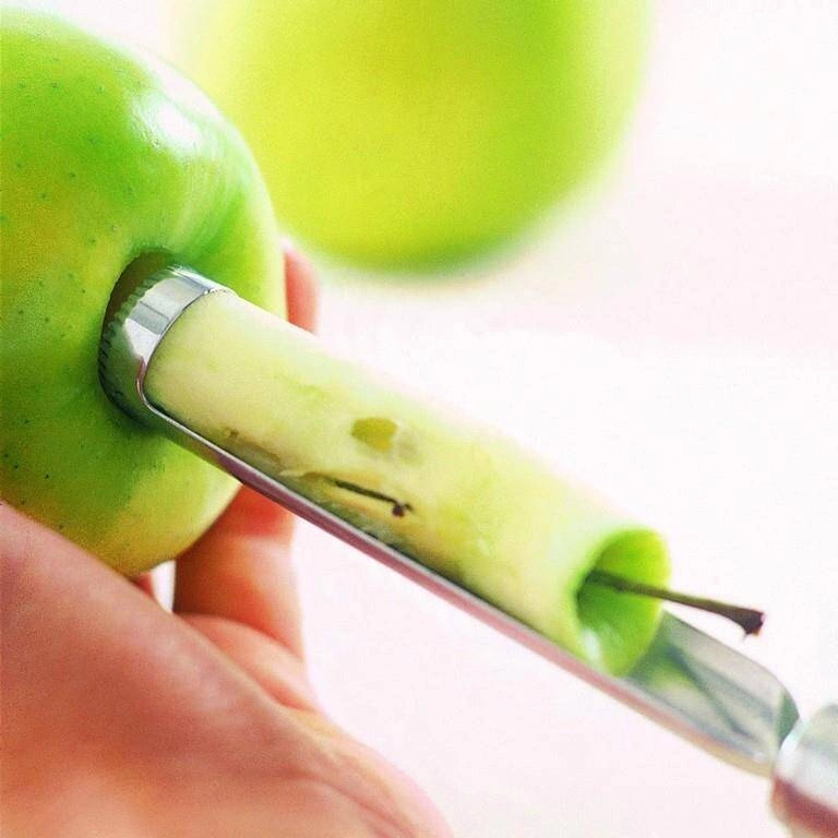Po przekręceniu wydrążacza do owoców z ostrym ząbkowanym przednim pierścieniem można go łatwo włożyć do owocu, aby usunąć rdzeń.
