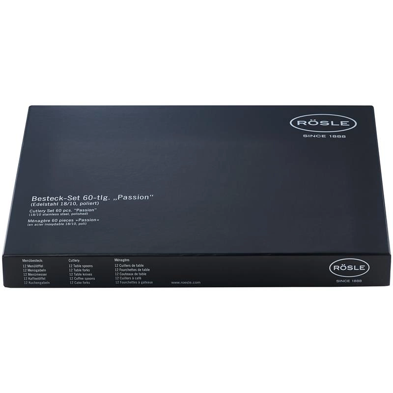 60 sztuk, dla 12 osób: 12 noży obiadowych, 12 widelców obiadowych, 12 łyżek obiadowych, 12 widelczyków do ciasta, 12 łyżeczek do kawy