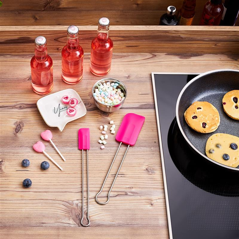Przednia część efektownej różowej skrobaczki do ciasta o długości 26 cm wykonana jest z wytrzymałego silikonu