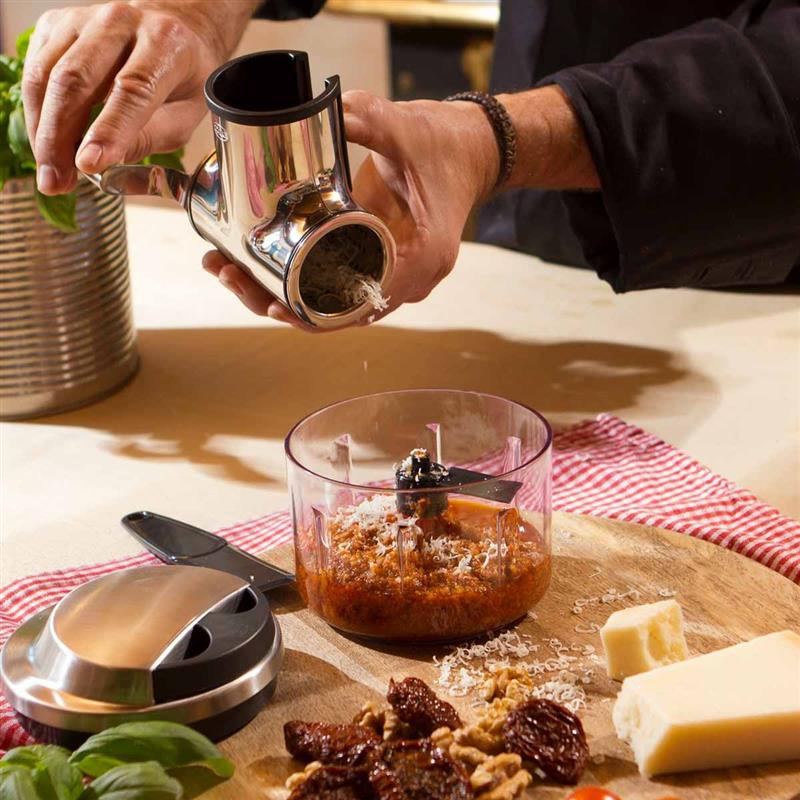 - wystarczy włożyć kawałek sera założyć pokrywkę dociskową, docisnąć kciukiem i zetrzeć twardy ser lub czekoladę kręcąc korbką