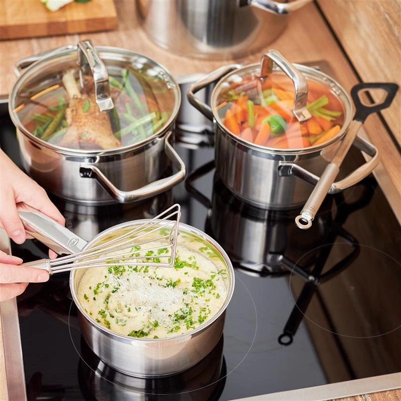 Pokrywki garnków wykonane z hartowanego szkła zapewniają widok wnętrza garnka i gotowanej potrawy.