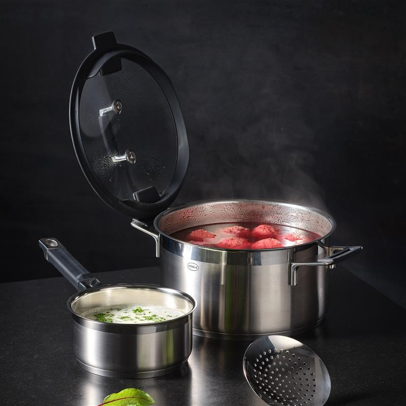 Garnek do gotowania, zaprojektowany z prostą elegancją i wyposażony w sprytne funkcje, oferuje pełen komfort i wszystko, czego potrzebuje współczesna kuchnia.