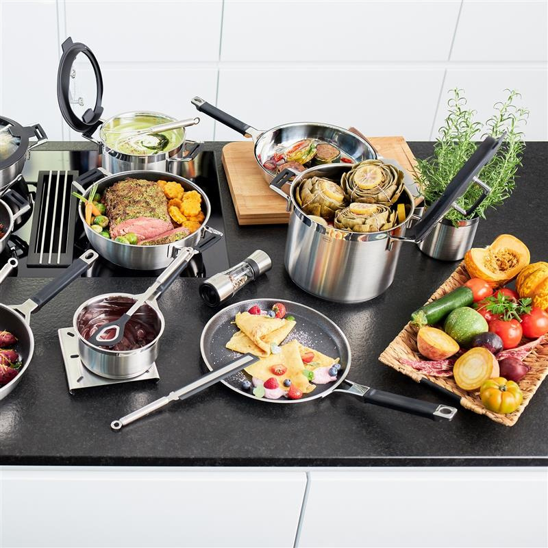 Idealnie nadaje się do zintegrowanych wyciągów oparów. Zamglenie jest usuwane bezpośrednio z boku garnka, a para nie gromadzi się w kuchni.