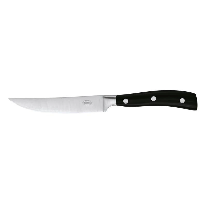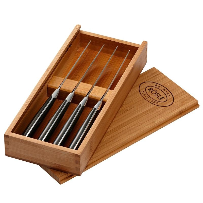 Roesle - Zestaw 4 noży do steków BBQ Roesle - Zestaw 4 noży do steków BBQ Idealny zestaw upominkowy dla miłośników steków! Zawiera: 4 noże do steków RÖSLE Plastikowy uchwyt z 3 nitami Ostrze wykonane ze stali nożowej Materiał: ostrze ze stali, POMP Opakowanie: drewniane pudełko (bambus) Wymiary: 24,5 x 10,7 x 4 cm Waga: 675 g
