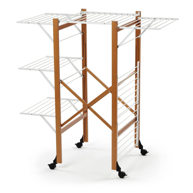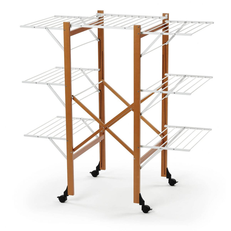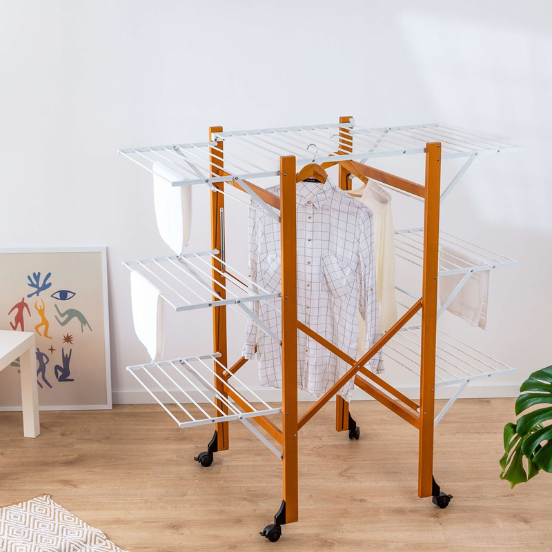 Konstrukcja suszarki wykonana jest w całości z litego drewna bukowego, co gwarantuje solidność produktu. Wraz z białymi sznurkami tworzy kombinację kolorów, która nadaje jej atrakcyjnego wyglądu. Suszarka AQUILONE wyposażona jest w 4 obrotowe kółka wykonane z niebrudzącej gumy. Dzięki nim możesz z łatwością ją przestawiać, a za jednym dotknięciem zablokować, by stała stabilnie. Natomiast po złożeniu zajmuje naprawdę niewiele miejsca, co czyni ją idealnym pomocnikiem do każdego domu.