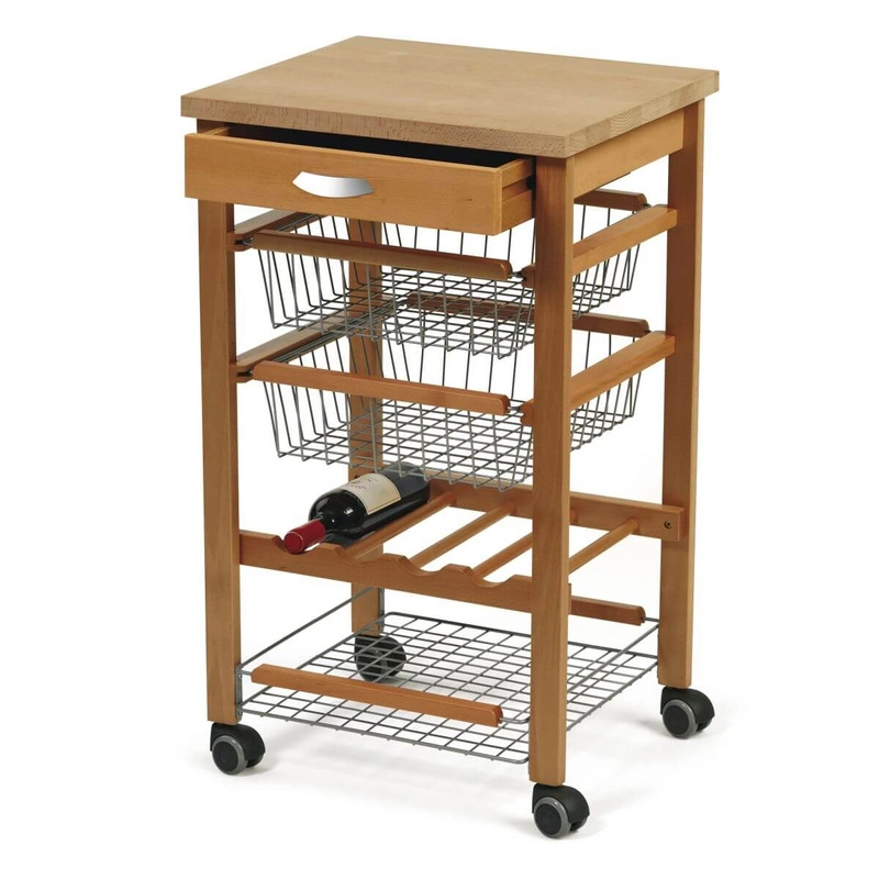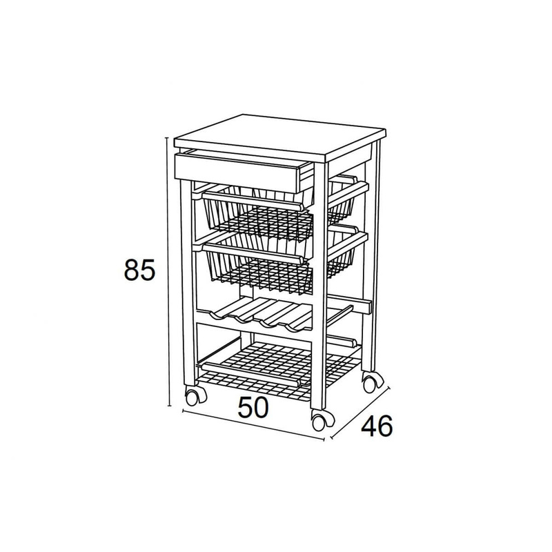 Wózek ARTURO został wyposażony w szeroką powierzchnię roboczą pokrytą melaminą, która jest łatwa w utrzymaniu czystości i odporna na uszkodzenia. Te cechy sprawiają, że wózek jest doskonałym miejscem do przygotowywania posiłków. Dzięki wysuwanym metalowym koszom oraz obszernej szufladzie, oferuje mnóstwo miejsca do organizacji różnych akcesoriów kuchennych oraz produktów spożywczych. Dodatkowo posiada dedykowaną półkę na butelki, co pozwala przechowywać olej, ocet czy oliwę zawsze w zasięgu ręki. Niezaprzeczalnym atutem są gumowe kółka, które zapewniają łatwe przemieszczanie wózka, ale też stabilność podczas pracy, dzięki możliwości ich blokady.