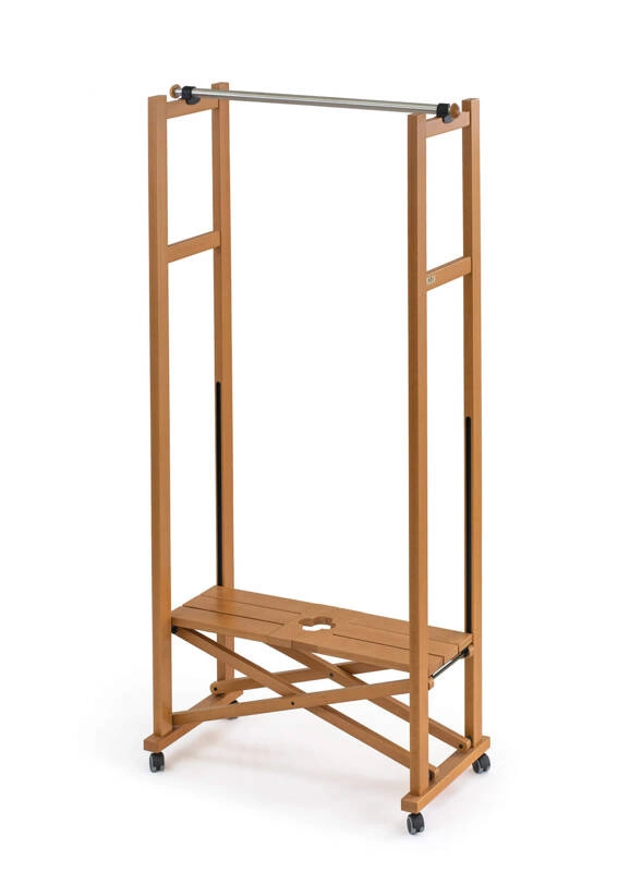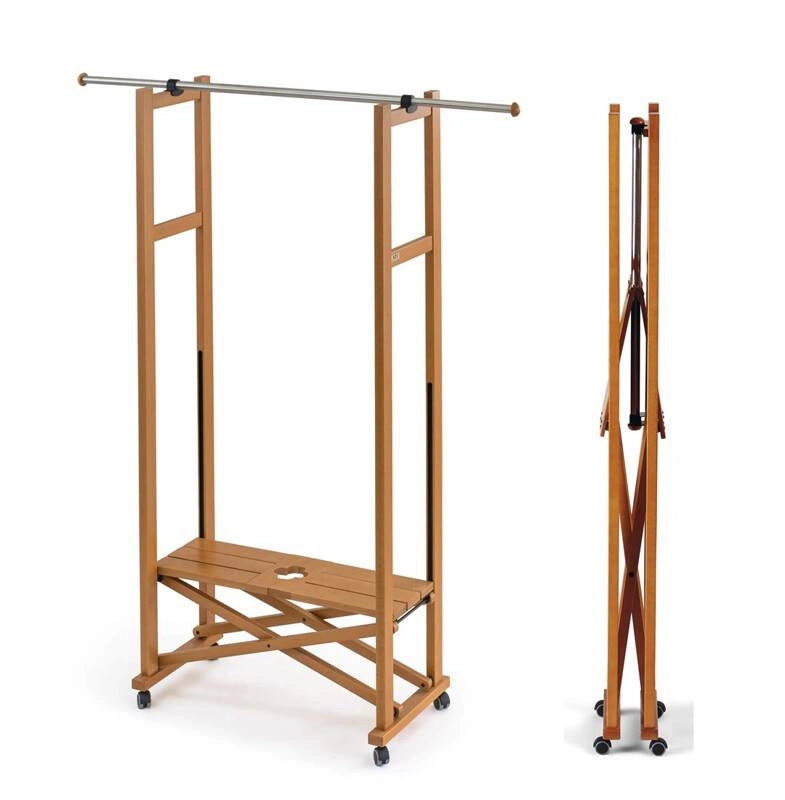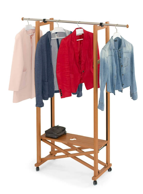 Jego design opiera się na solidnej konstrukcji z drewna bukowego, co oprócz estetycznego wyglądu zapewnia także trwałość i stabilność. Dzięki rozsuwanemu drążkowi ze stali nierdzewnej, którego długość można regulować od 78 do aż 140 cm, dostosujesz stojak do swoich obecnych potrzeb przechowywania. Szeroka dolna półka wykonana z drewna, zapewnia dodatkowe miejsce na buty, torebki czy inne akcesoria, co sprawia, że organizacja przestrzeni staje się o wiele łatwiejsza. Ponadto, dzięki obrotowym gumowym kółkom, stojak jest bardzo łatwy w przemieszczaniu pomiędzy pomieszczeniami.
