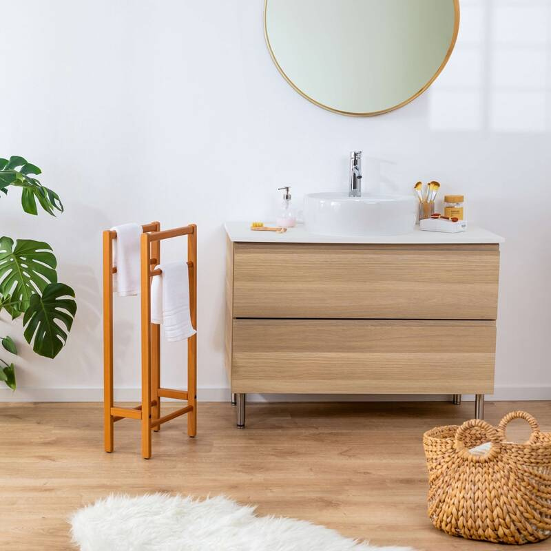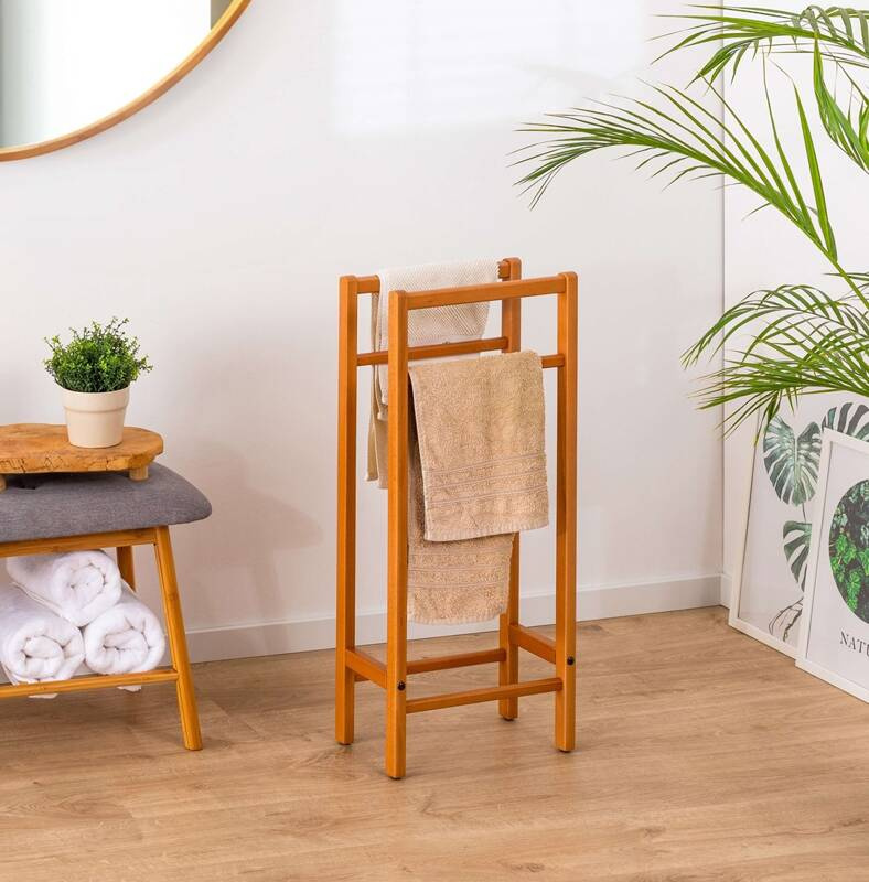 SALVI' to elegancki stojak na ręczniki, który ułatwi Ci organizację przestrzeni w łazience. Stabilna konstrukcja z drewna bukowego pozwala na swobodne ustawienie go w pobliżu umywalki, wanny lub prysznica, zapewniając wygodny dostęp do suchych ręczników, a jednocześnie miejsce do odwieszania tych mokrych.