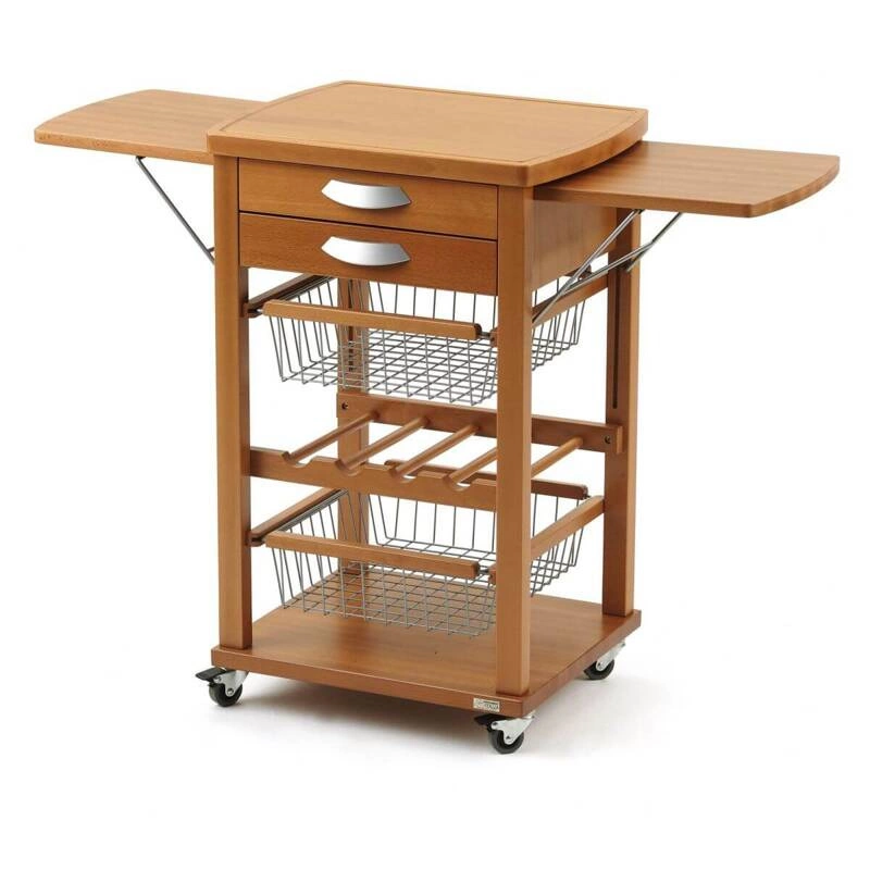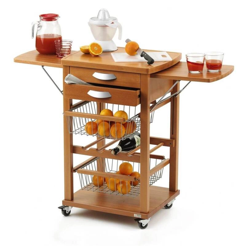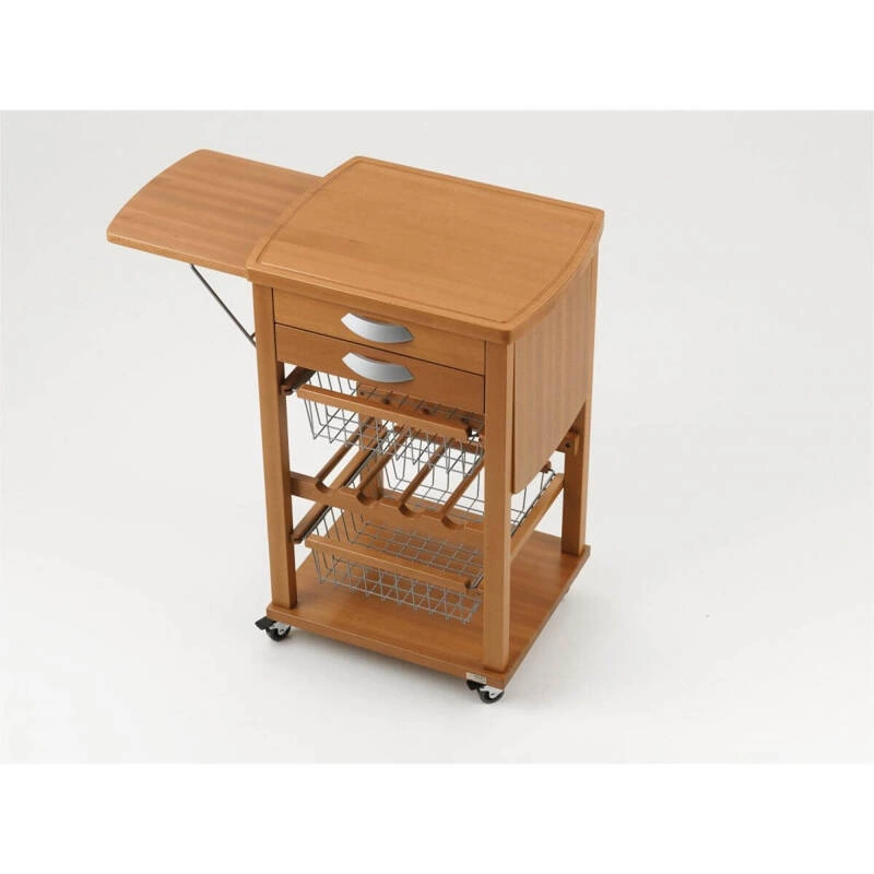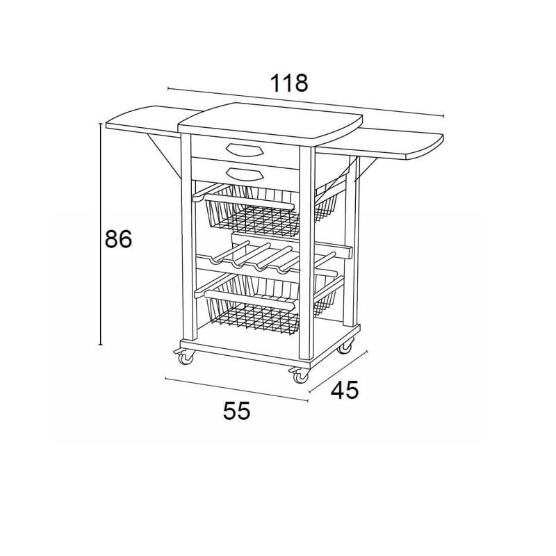 Ten funkcjonalny wózek kuchenny wyposażony jest w powierzchnię roboczą, która zapewnia odpowiednią ilość miejsca do przygotowywania potraw. Dodatkowo, posiada dwie otwierane półki boczne, umożliwiające organizację potrzebnych akcesoriów kuchennych w zasięgu ręki. Wyposażony jest w dwa metalowe kosze oraz dwie drewniane szuflady do przechowywania produktów spożywczych czy najważniejszych przyborów: sztućców, butelek, słoików i wielu innych. Niezaprzeczalnym atutem są gumowe kółka, które zapewniają łatwe przemieszczanie wózka, ale też stabilność podczas pracy, dzięki możliwości ich blokady.