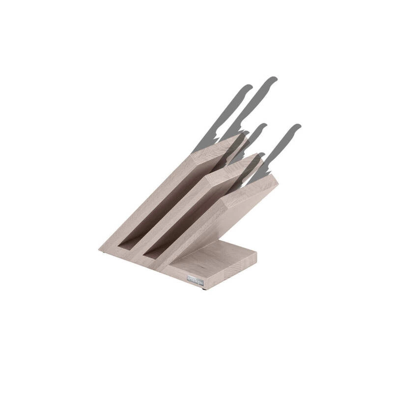 Stojak może pomieścić do 6 noży o maksymalnej długości ostrza 29 cm. Wykonany jest z litego drewna bukowego i pokryty specjalnym lakierem dopuszczonym do kontaktu z żywnością.