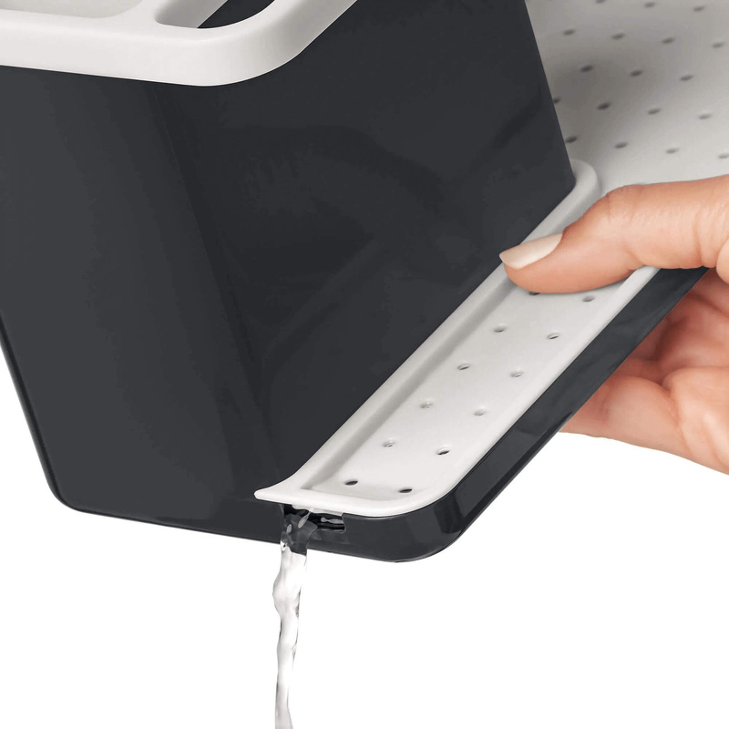 Organizer wyposażony jest w ruchome przegródki, które pozwalają na zorganizowanie gąbek, szczotek, płynów do mycia naczyń i innych akcesoriów kuchennych w jednym, łatwo dostępnym miejscu. Ponadto, praktyczna tacka ociekowa umożliwia bezpieczne gromadzenie nadmiaru wody, minimalizując ryzyko dostania się jej na powierzchnię blatu.