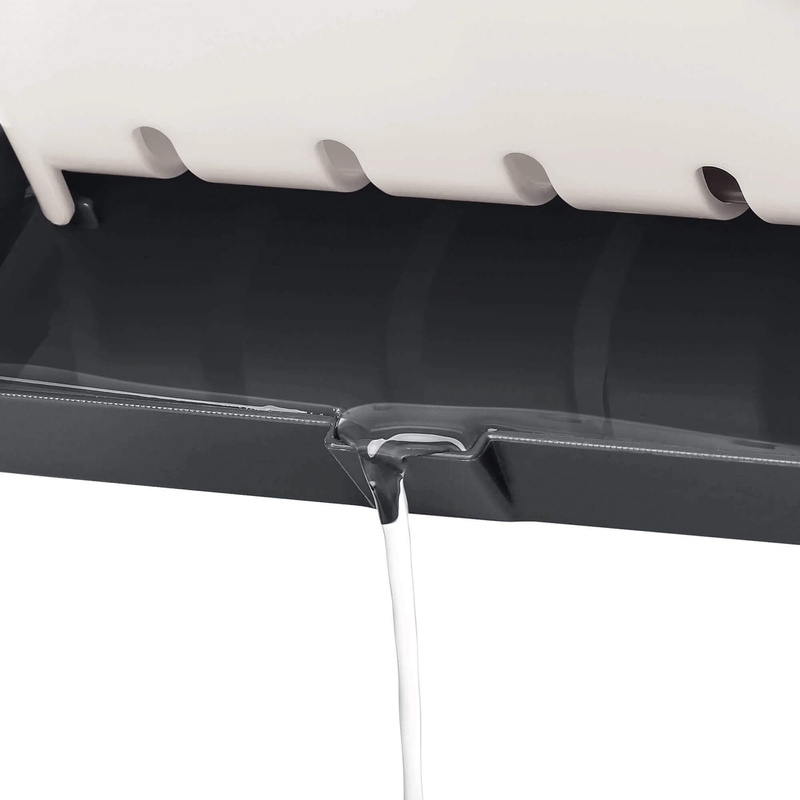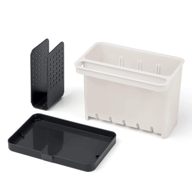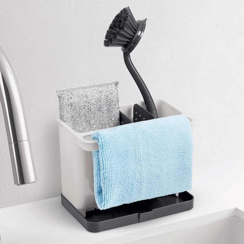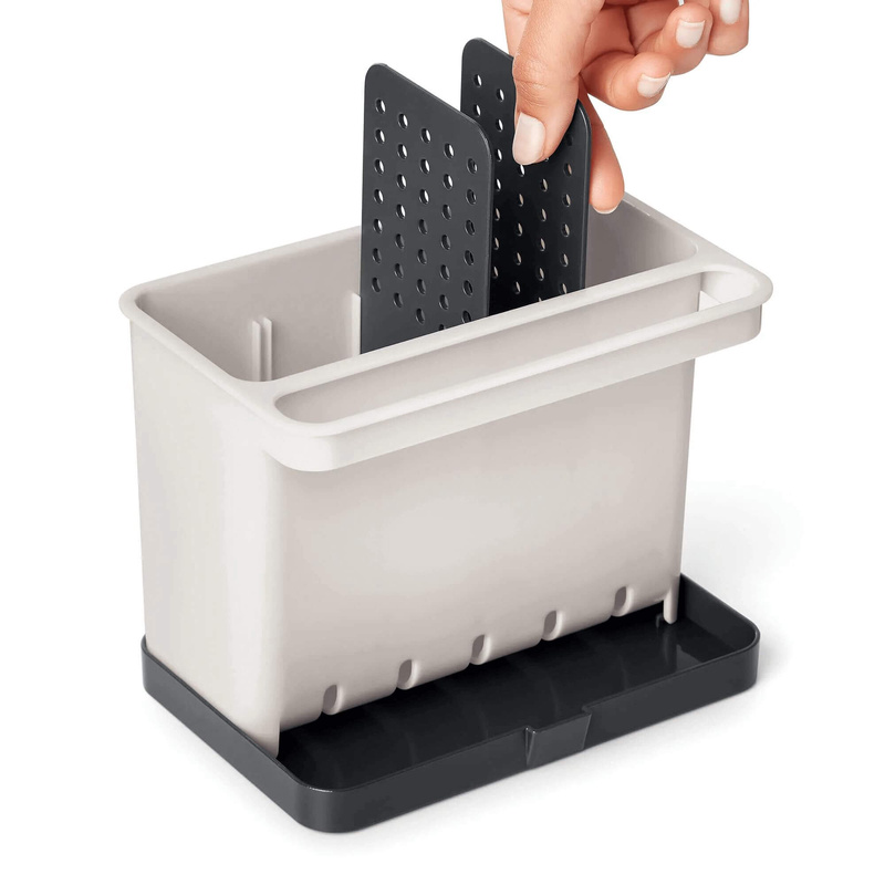 Organizer wyposażony jest w ruchome przegródki, które pozwalają na zorganizowanie gąbek, szczotek, płynów do mycia naczyń i innych akcesoriów kuchennych w jednym, łatwo dostępnym miejscu. Ponadto, praktyczna tacka ociekowa umożliwia bezpieczne gromadzenie nadmiaru wody, minimalizując ryzyko dostania się jej na powierzchnię blatu.