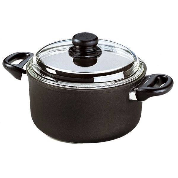 Mały garnek z żaroodporną pokrywą z serii Titanium 2000 plus, niemieckiej firmy SKK to najwższa jakość wśród naczyń z powłokami nieprzywieralnymi. Solidny, wytrzymały gruby aluminiowy odlew jest wielowarstwowo pokryty tytanem oraz najwyższej jakości powłoką nieprzywieralną Nonstick 2000 Plus.