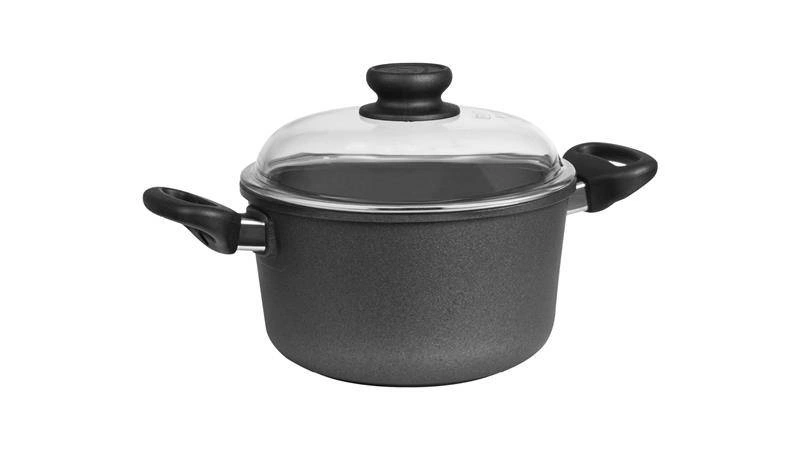 Średniej wielkości garnek z żaroodporną pokrywą z serii Titanium 2000 plus, niemieckiej firmy SKK to najwższa jakość wśród naczyń z powłokami nieprzywieralnymi. Solidny, wytrzymały gruby aluminiowy odlew jest wielowarstwowo pokryty tytanem oraz najwyższej jakości powłoką nieprzywieralną Nonstick 2000 Plus.