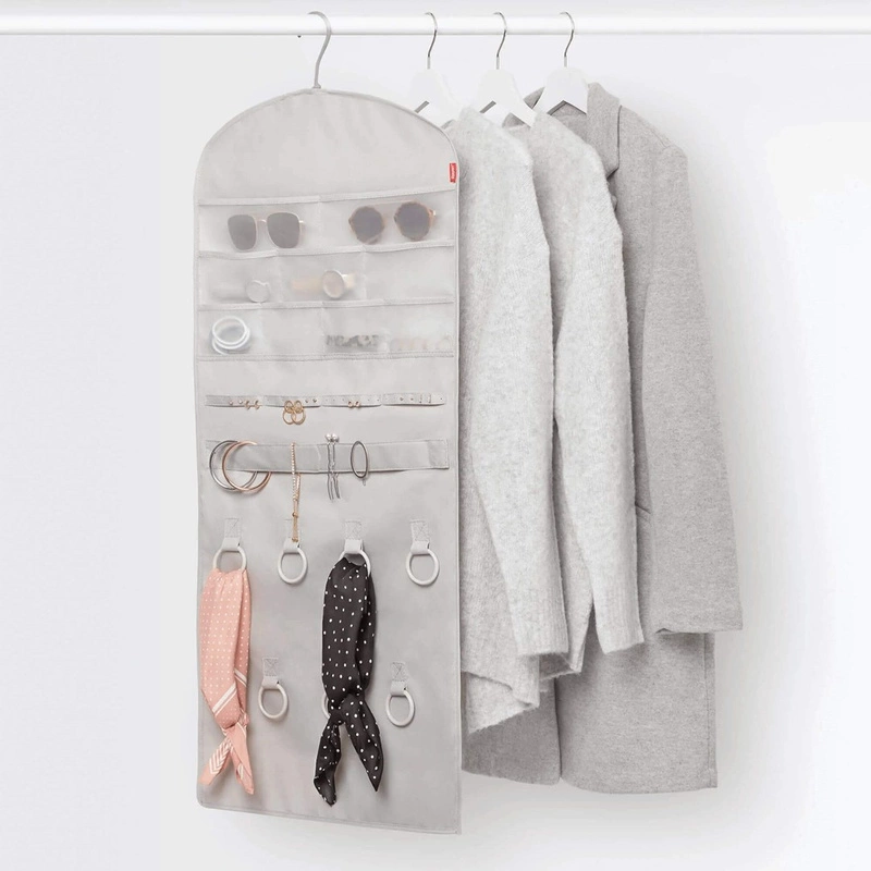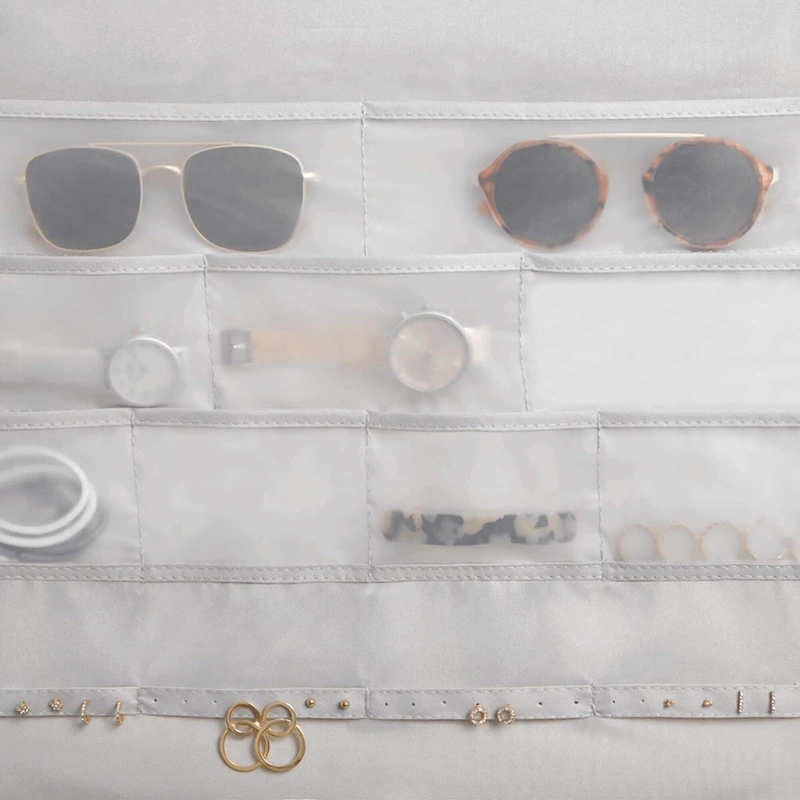 Dzięki specjalnie zaprojektowanym kieszonkom, możesz wygodnie i bezpiecznie przechowywać swoje ulubione naszyjniki, bransoletki, kolczyki i wiele innych drobnych bibelotów i drobiazgów. Dodatkowo, specjalne miejsca na apaszki czy okulary pozwala na łatwe utrzymanie porządku w Twoich ulubionych akcesoriach.