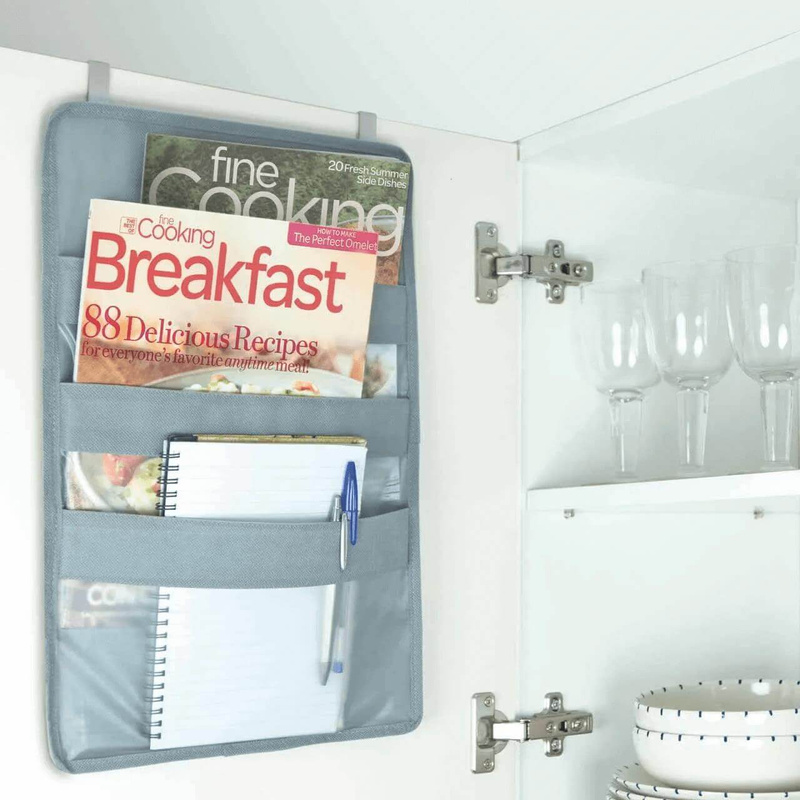 Wiszący organizer – wygodne rozwiązanie do przechowywania przepisów, notatek i ulubionych czasopism kulinarnych.