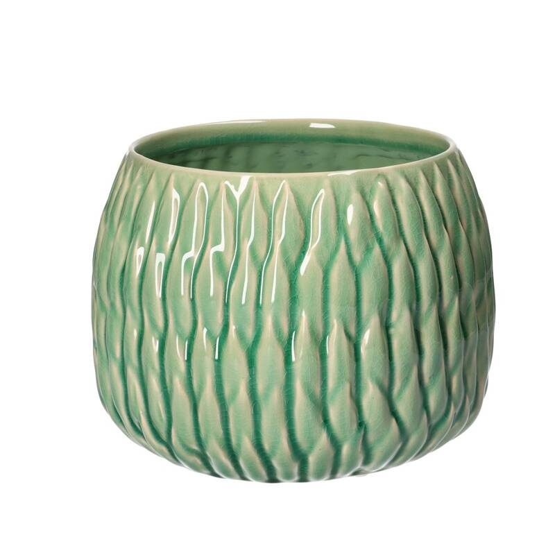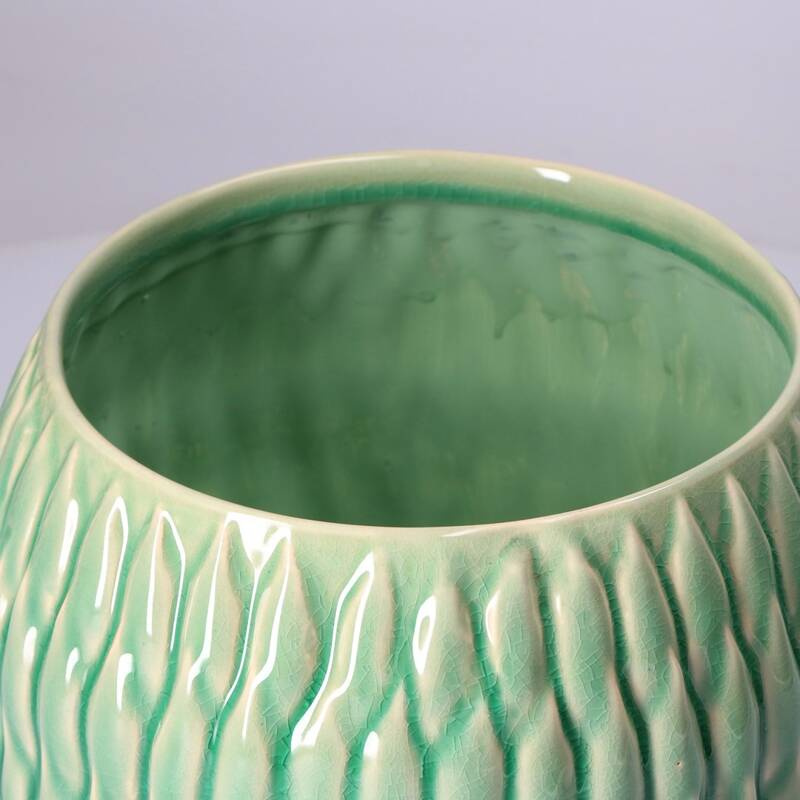 Kolekcja AGAVINA to harmonijne połączenie elegancji i funkcjonalności. Wykonana z wysokiej jakości kamionki, charakteryzuje się subtelną, zieloną glazurą, która dodaje jej naturalnego i wyrafinowanego wyglądu. Każdy element tej serii, od donicy po wazony, jest zdobiony regularnymi żłobieniami, inspirowanymi naturą. Ta wyrazista tekstura tworzy wyjątkowy efekt, nadając przedmiotom trójwymiarowy wygląd.