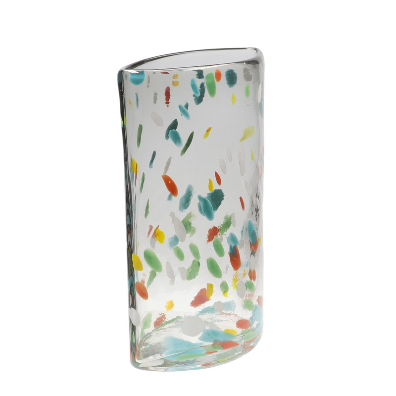 Wazon CARNIVAL to wyjątkowy element dekoracyjny, który urzeka swoim nietuzinkowym wzornictwem i żywą paletą kolorów. Wykonany z przezroczystego szkła, jest ozdobiony licznymi zdobieniami w odcieniach zieleni, czerwieni, żółci, pomarańczy, błękitu i turkusu. Nieregularny kształt dodaje mu charakteru i sprawia, że staje się unikatowym dodatkiem w każdym wnętrzu.