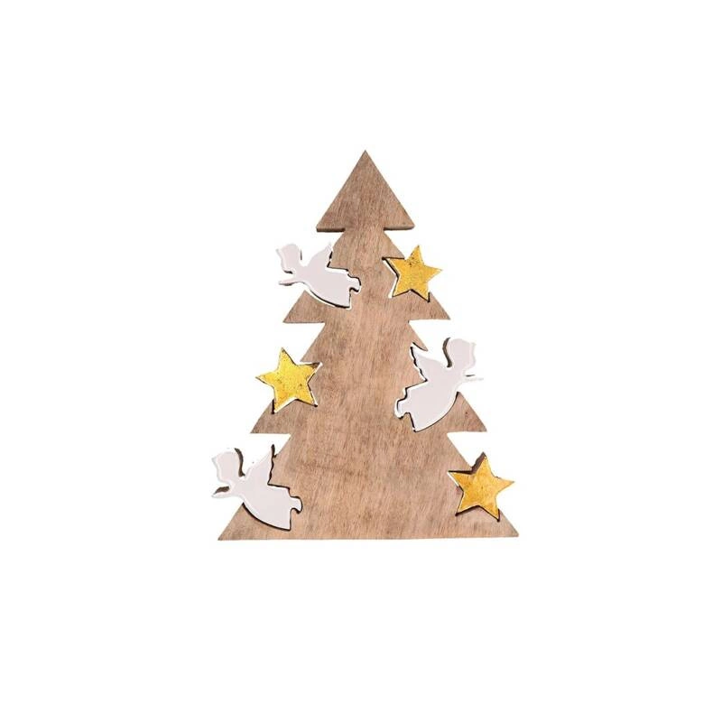 Cechy szczególne- Drewniana choinka z białymi aniołkami i złotymi gwiazdkami