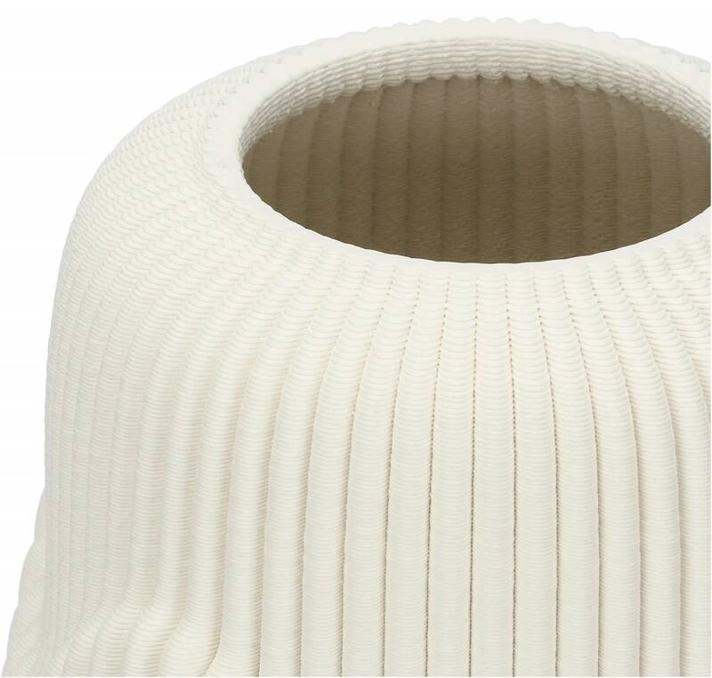 Biały wazon Lino to wyjątkowy element dekoracyjny, który zachwyca swoim wyglądem. Jego design inspirowany jest wyglądem prawdziwej tkaniny, z delikatnymi i regularnymi żłobieniami, które dodają mu niepowtarzalnego uroku. Wykonany ze specjalnej porcelany przy użyciu zaawansowanej technologii druku 3D, wazon charakteryzuje się niespotykaną precyzją i detalami.