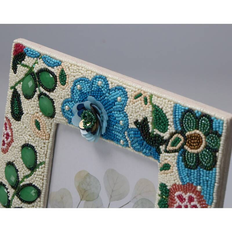 Kolekcja MILLE306PERLINE to wyjątkowa seria ramek na zdjęcia, które emanują radosnym, artystycznym stylem, wprowadzając do wnętrza energię natury. Każda ramka ozdobiona jest pięknymi wzorami w kwiaty i liście, wykonanymi z bawełny i szklanych koralików. Tworzą one bogato zdobiony, trójwymiarowy efekt, który dodaje wnętrzu przytulności i harmonii.