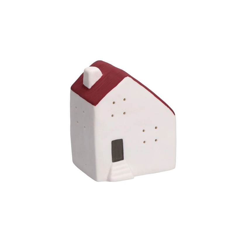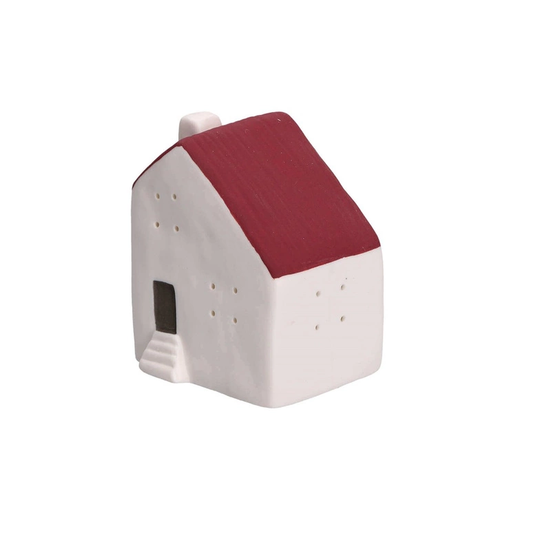 - Biały domek z czerwonym daszkiem i miniaturowymi okienkami