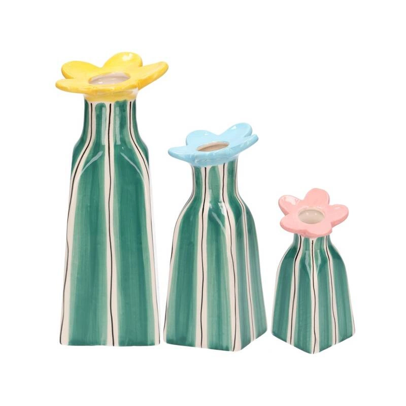Wazony te charakteryzują się subtelnymi, pastelowymi barwami i delikatnymi liniami, które doskonale komponują się z każdym rodzajem dekoracji. Każdy wazon ma inny, ale harmonijny kształt i kolor — żółty, błękitny i różowy, co pozwala na twórcze zestawienia i aranżacje. Dzięki swojej prostocie i elegancji, są idealne do umieszczenia pojedynczego kwiatu, takiego jak tulipan czy róża, który zostanie pięknie wyeksponowany i stanie się centralnym punktem dekoracji.