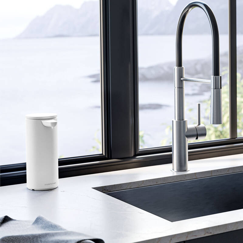 Idealne narzędzie do bezdotykowego dozowania mydła bez pozostawiania zarazków. Mieści o 50% więcej mydła niż standardowy dozownik Simplehuman, dzięki czemu będziesz go rzadziej uzupełniać. Odporna na zatykanie pompa rurkowa zapewnia precyzyjny i stały przepływ, a silikonowy zawór zapobiega niepożądanemu kapaniu. Aby kontrolować żądaną ilość mydła, możesz umieścić rękę blisko czujnika- aby dodać trochę mydła, i dalej- aby uzyskać więcej. Szeroki otwór do napełniania sprawia, że uzupełnianie jest szybkie i łatwe.