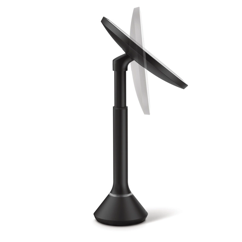 Lustro z czujnikiem Simplehuman zapala się automatycznie, gdy zbliża się Twoja twarz. System oświetlenia Tru-lux symuluje naturalne światło słoneczne, pozwalając zobaczyć pełną różnorodność kolorów, dzięki czemu będziesz wiedzieć, kiedy Twój makijaż będzie miał prawidłowy kolor i będzie nieskazitelny. Ma również ustawienie światłą “przy świecach”, dzięki czemu możesz sprawdzić swój wygląd przy słabym świetle. Sterowanie dotykowe zapewnia szybką i intuicyjną kontrolę nad ciągłym zakresem jasności. W przeciwieństwie do tradycyjnego oświetlenia lusterek do makijażu, trwałe diody LED Simplehuman nie przepalą się ani nie zmniejszą się nawet po latach użytkowania. Lustro jest bezprzewodowe i można je ładować za pomocą dołączonego przewodu USB-C – jedno ładowanie wystarcza na 5 tygodni. Powiększenie 5x — idealne jest do zauważenia wyjątkowych szczegółów, a jednocześnie umożliwia zobaczenie całej twarzy.